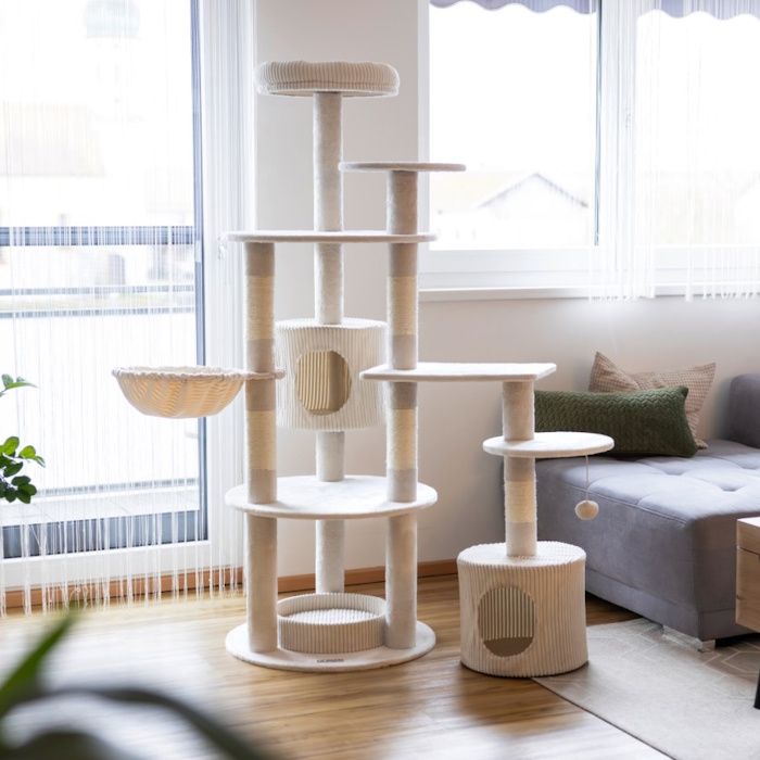- Moderno mačje drevo s številnimi možnostmi za poležavanje in spanje v trendovskem videzu je primerno za gospodinjstva z več mačkami. Vašim mucam tako mačje drevo ponuja nešteto možnosti za igro, zabavo in počitek.