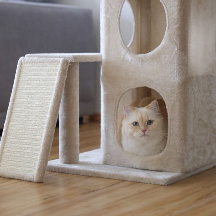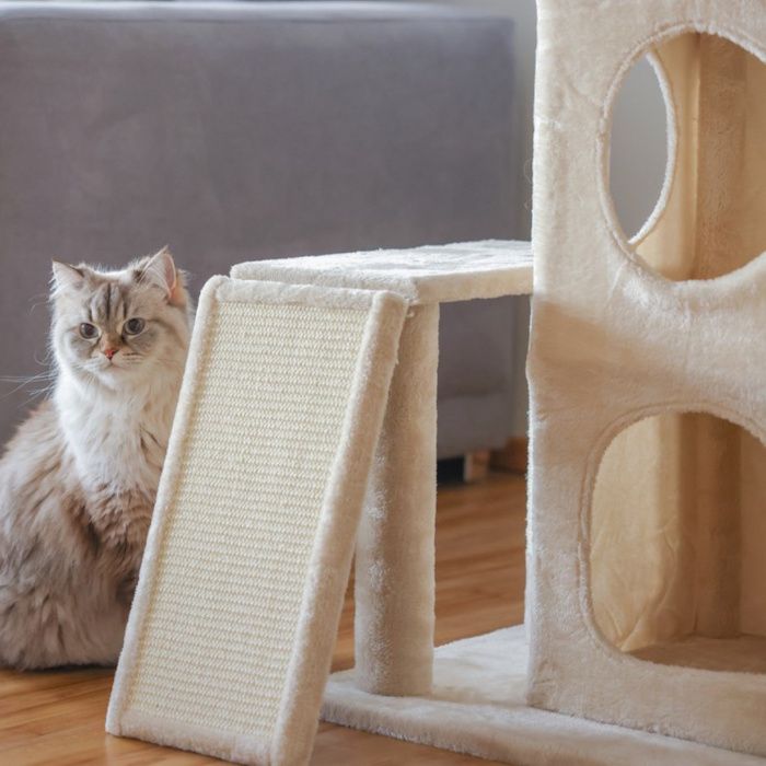 - Praskalnik s klančino za mačke je na voljo v bež barvi.