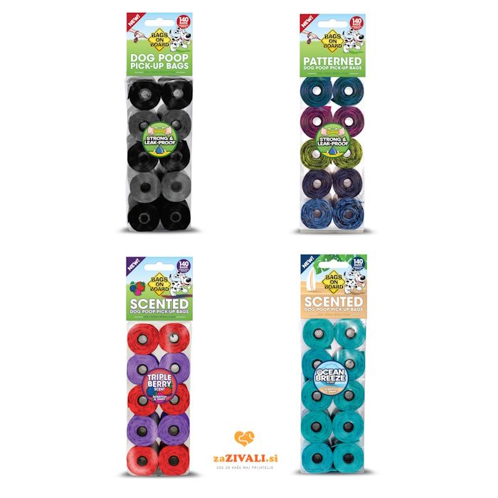 Vrečke za iztrebke Bags On Board so nadomestne plastične vrečke za drekce v različnih barvah ali s potiskom, odišavljene ali klasične.