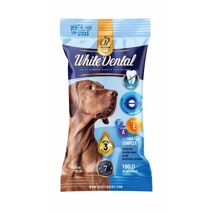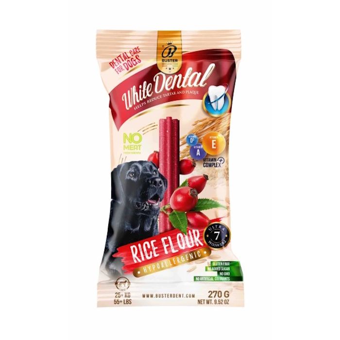- Buster White Dental Rosehips dentalne palčke za nego zob velikih psov nad 25 kg so dentalni priboljšek, ki krepi imunski sistem psa.